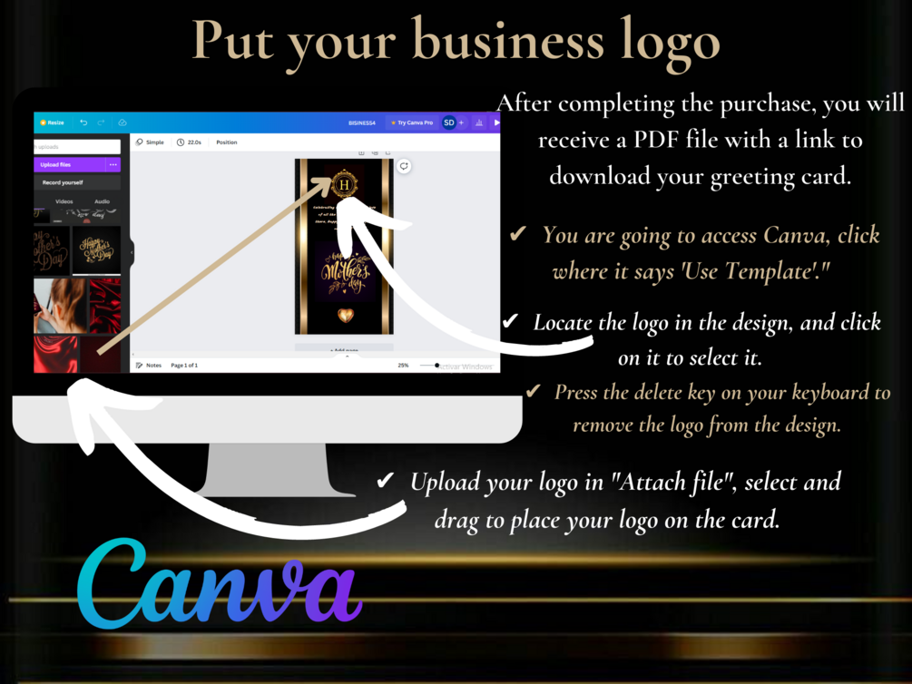 After making the purchase, you will receive an email with a link to download the PDF file. This link will take you to the Canva template, where you an start designing and editing your card right away