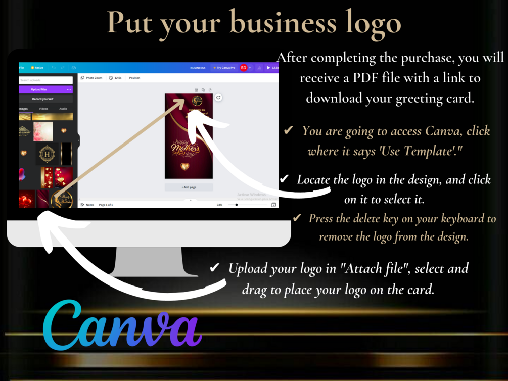 After making the purchase, you will receive an email with a link to download the PDF file. This link will take you to the Canva template, where you an start designing and editing your card right away