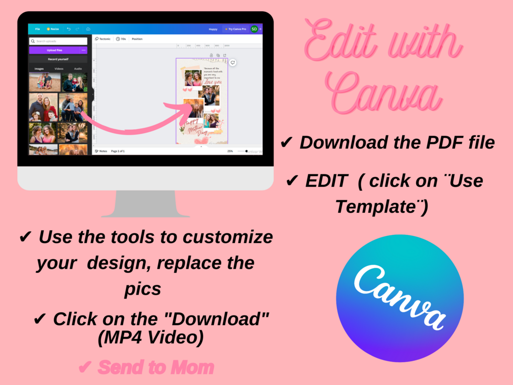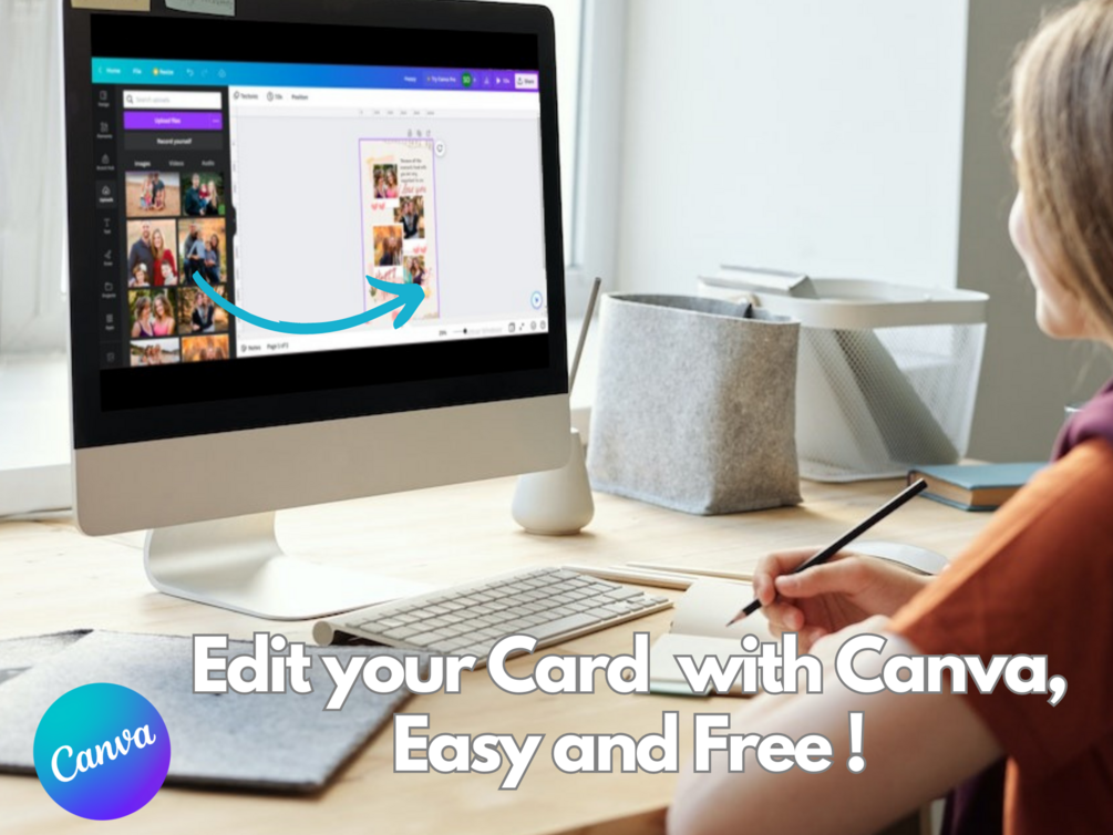 After making the purchase, you will receive an email with a link to download the PDF file. This link will take you to the Canva template, where you an start designing and editing your card right away